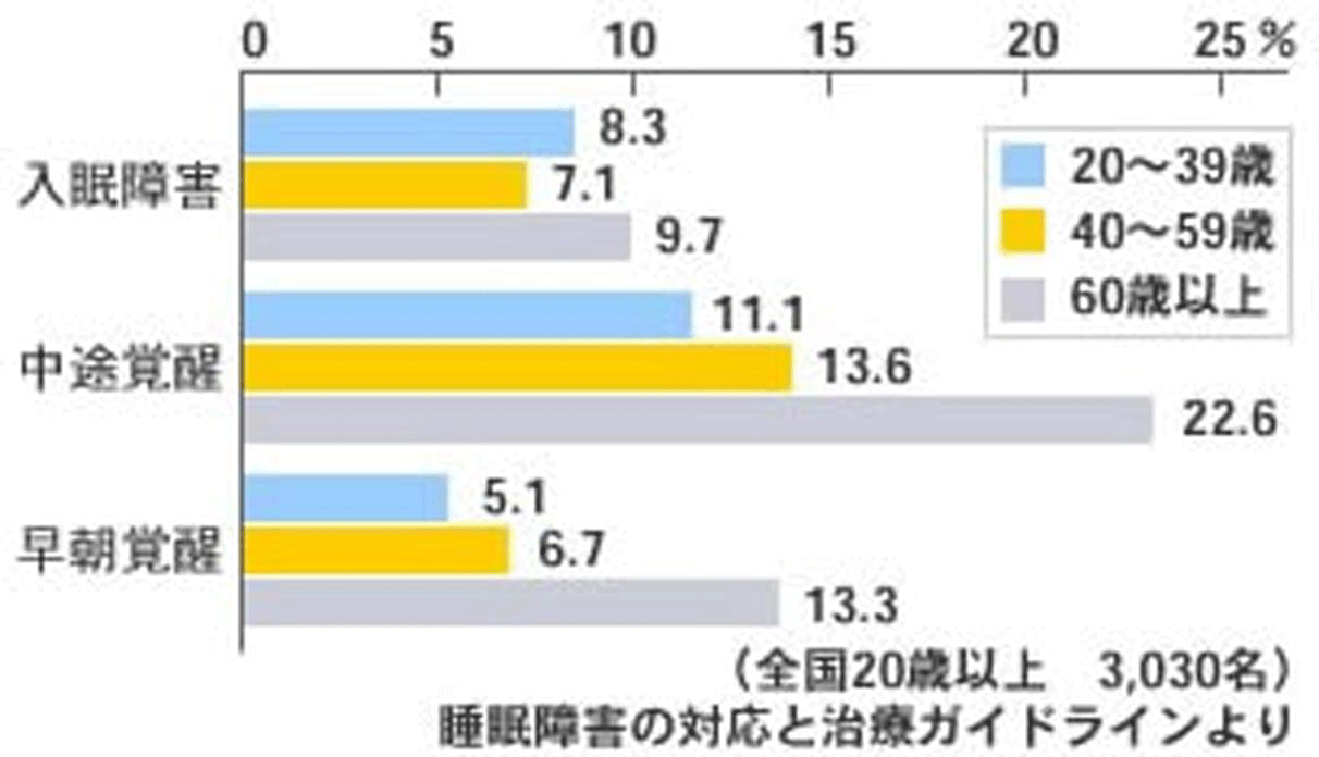 日本人を対象にした調査によれば、5人に1人が「睡眠で休養が取れていない」、「何らかの不眠がある」と回答している。また、加齢とともに不眠に苦しむ人の数は増加している。60歳以上の方では約3人に一人が睡眠問題で悩んでいる。そのため通院している方の20人に1人が不眠のため睡眠薬を服用している。