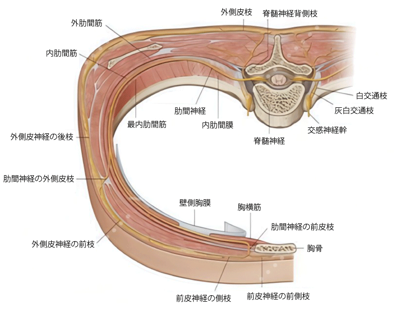 帯状疱疹は、帯状疱疹ウイルスが神経の中を通って皮膚に達して皮疹を起こす疾患だが、胸部に発症すると肋間神経痛を起こす。帯状疱疹による肋間神経痛は、皮疹の有無に関わらず「ヒリヒリ」「ジクジク」とした皮膚表面の持続的な痛みを感じる。