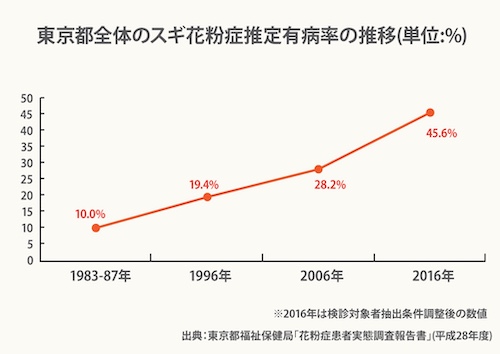 花粉症は、スギなどの花粉が鼻や目の結膜を刺激することによって起こるアレルギー疾患の一つであり、特にスギ花粉症は冬の終わりから春にかけて、毎年、くしゃみ、鼻水、鼻詰まり、涙が止まらないなどの症状で多くの人を悩ませている。日本では花粉症の患者が近年増加傾向であるが、その原因はスギ花粉の飛散量増加であるといわれている。スギは植林後40年ほどたつと成木になり、花粉を飛散し始めるが、植林されたスギの大半が樹齢40~60年となっており、活発に花粉を飛散させる時期を迎えているからである。また、日本ではスギのほかにもヒノキ、イネ、ブタクサ、ヨモギなど約50種類の植物の花粉が花粉症を引き起こすといわれており、複数の抗原にアレルギーを持っている人の中には1年中症状に悩む人も少なくない。